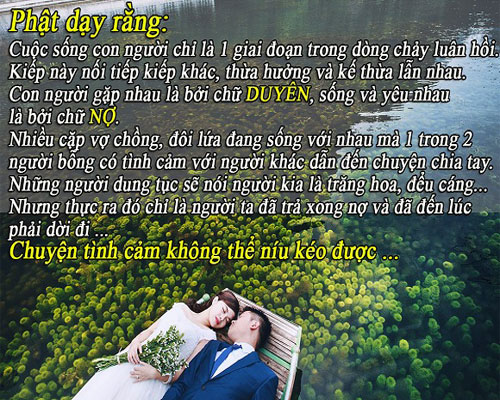 Vì sao ở thế gian có đôi vợ chồng sống với nhau rất hạnh phúc nhưng chỉ một thời gian ngắn ngủi rồi chia tay? Vì sao có đôi bạn trẻ yêu nhau rất lâu khi sắp thành hôn lại bỏ nhau? – Đó là duyên, nợ đã hết: