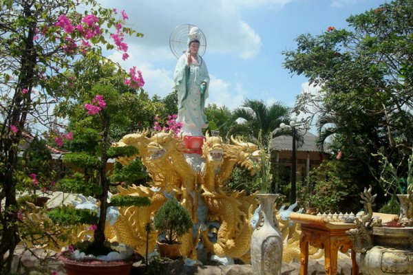 Trong khuôn viên, phía trước chùa có tượng Phật Bà Quan Âm đứng uy nghi trên đài sen, tay cầm bình nước cam lồ tưới nhuần ơn phước cho chúng sinh. Bên trái chùa là tượng Phật Thích Ca tĩnh tọa dưới sự che chở của chín con rồng, đằng sau là cội bồ đề râm mát. Bên phải chùa là tượng Phật Di Lặc với nụ cười viên mãn cho một thời kỳ mai sau con người sống hết sức an lạc…