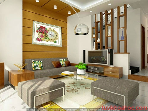 Phòng khách nên sơn màu vàng sáng hay màu vàng mơ nhẹ, trần phòng màu trắng.