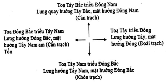 – Những người có năm sinh thuộc các quẻ Càn, Khôn, Cấn, Đoài là thuộc Tây tứ mệnh, nên chỉ có thể chọn những nhà có tọa thuộc các hướng Tây Bắc, Tây Nam, Đông Bắc và Tây, tức nhũng nhà thuộc Tây tứ trạch.