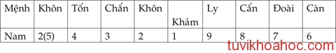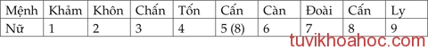 Bảng tính mệnh quái được quy ước như sau