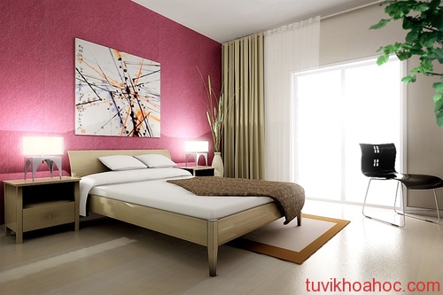 - Màu sắc cho phòng ngủ tốt nhất là các màu nhạt nhẹ. Nên chọn các màu hồng nhạt, trắng, kem, xanh nhẹ để không gây một cảm giác bị ức chế khi ở trong căn phòng