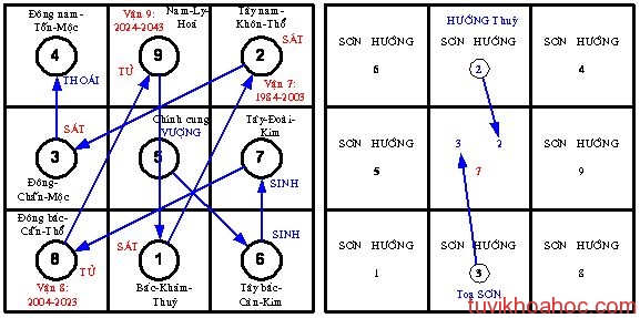 Giả sử nhà ở hướng Nam-Địa và thì khi tra bảng sơn (số 3) sẽ vận động theo hướng thuận, còn hướng (số 2) sẽ vận động theo hướng nghịch. Kết quả được trình bày ở hình dưới.
