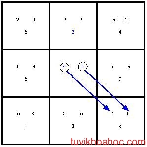 Bước 1: giả sử nhà được xây dựng trong vận 7 thì số 7 được đặt vào trung tâm, các số khác được đặt vào các ô còn lại theo quy luật vận động của cửu cung như ở hình bên.