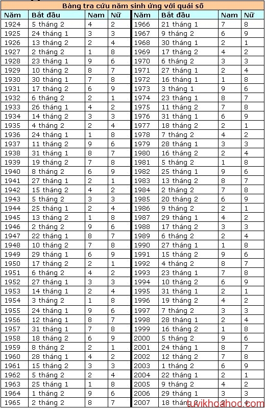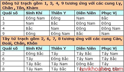 Quái số được chia làm hai nhóm là Đông tứ trạch gồm 1, 3, 4, 9 và Tây tứ trạch gồm 2, 6, 7 và 8. Mỗi quái số đều bao hàm các hướng “cát”, “hung”; trong đó, các hướng Sinh Khí và Diên Niên là các hướng “thượng cát”, hướng Thiên Y là hướng “trung cát” và hướng Phục Vị là hướng “tiểu cát”. Sau khi có được quái số, tiếp tục tra bảng dưới đây để xác định các hướng “cát” tương ứng với nó:
