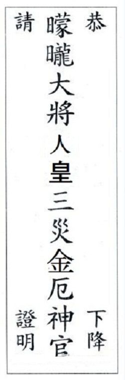 Nay con thành tâm thiết bày phẩm vật, cầu xin “Mông Long Đại Tướng Nhân Hoàng Tam Tai Kim Ách Thần Quan”. Xin ngài hãy phù hộ độ trì cho con và các thành viên trong gia đình được mạnh khỏe bình an, tai qua nạn khỏi, phiền não đoạn diệt, nghiệp chướng tiêu trừ, thường hoạch kiết tường, vĩnh ly khổ ách.