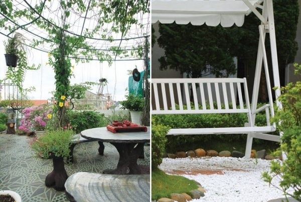 Hợp đất: Về cấu tạo, vườn mái nên theo kiểu “vườn treo” tức là các phần để chậu, đất trong cây hoặc hồ nước không đặt trực tiếp lên sàn sân thượng, mà được làm cách khoảng nhằm chống thấm và tiện xử lý kỹ thuật. Nhìn từ ngoài vào thì những loại vườn này trông như sàn bình thường nhưng bên trong là các tấm đan bê tông kê trên gối gạch (sàn hai lớp, trải tấm chống thấm, có ống thoát nước đi chìm). Nhờ tính chất của các lớp cách nhiệt, chống thấm… mà hiệu quả sử dụng và bảo vệ của mái nhà tăng cao hơn là để mái bằng trơ trọi. Các vật liệu sử dụng trên vườn mái có thể là gạch gốm, đá chẻ, sỏi… và cần sự tư vấn cụ thể của nhà chuyên môn.Hợp người: Ngay cả khi chọn được cây cối và thiết kế đẹp mắt thì không phải ngôi nhà nào cũng duy trì được khoảng vườn trên mái. Do mỗi người mỗi ý, công việc, thời gian chăm sóc vườn ít sẽ khiến cây cối xơ xác, đọng nước, thấm dột… Vì thế, nên tính tới hoàn cảnh từng gia đình, thời gian dành cho vườn, cơ cấu sinh hoạt có hay sử dụng vườn hay chỉ là trồng cho… vui. Cũng cần bố trí khoảng tập thể dục hoặc lối đi lại, chỗ ngồi nghỉ, một bộ bàn ghế cắm dù… sẽ giúp gia chủ thưởng thức trọn vẹn hơn không gian xanh nơi tổ ấm của mình.