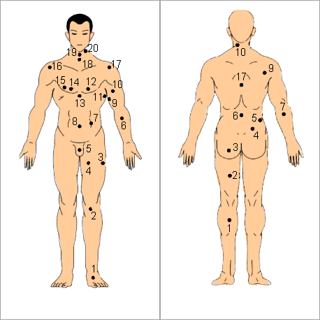 Phần ở vai và cánh tay gồm các nốt ruồi 6, 9, 10, 16, 17